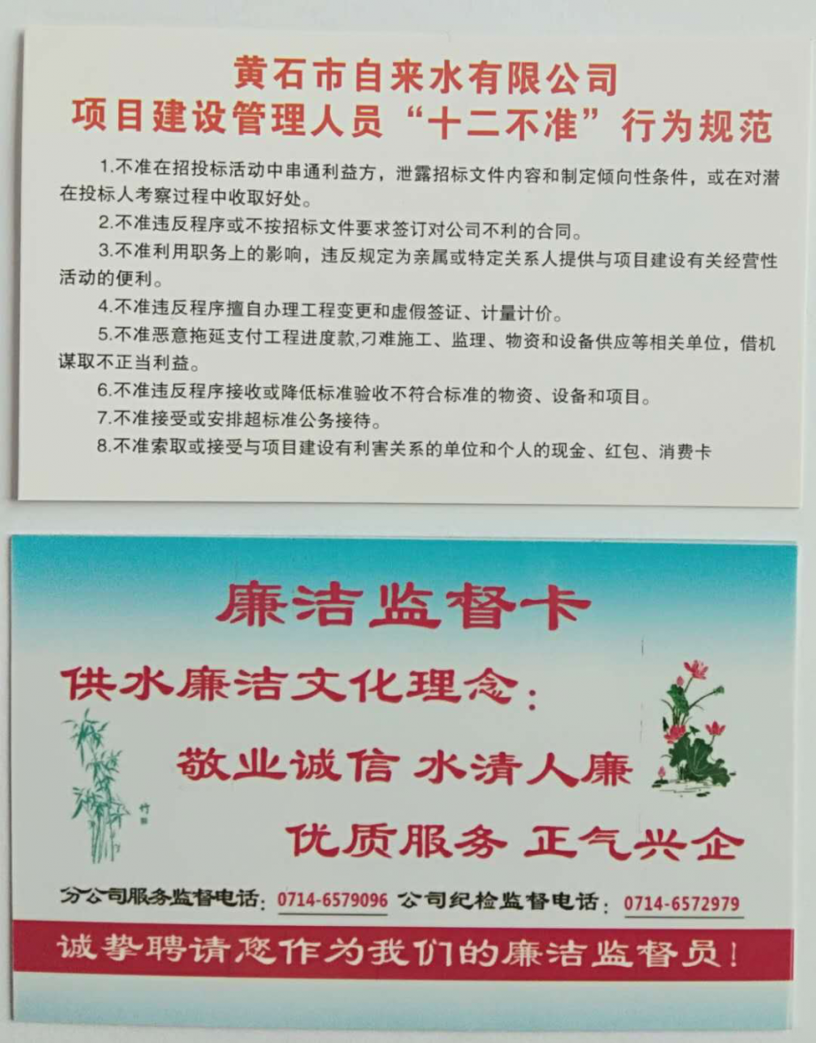 送廉助廉:到建設工地發(fā)放《“十二不準”行為規(guī)范》廉潔小卡片,向落戶企業(yè)送《供水服務廉潔監(jiān)督卡》,與經(jīng)濟合同雙方協(xié)簽定《廉潔共建協(xié)議書》,同職工家屬簽訂《家庭助廉協(xié)議書》,共建廉潔防線。