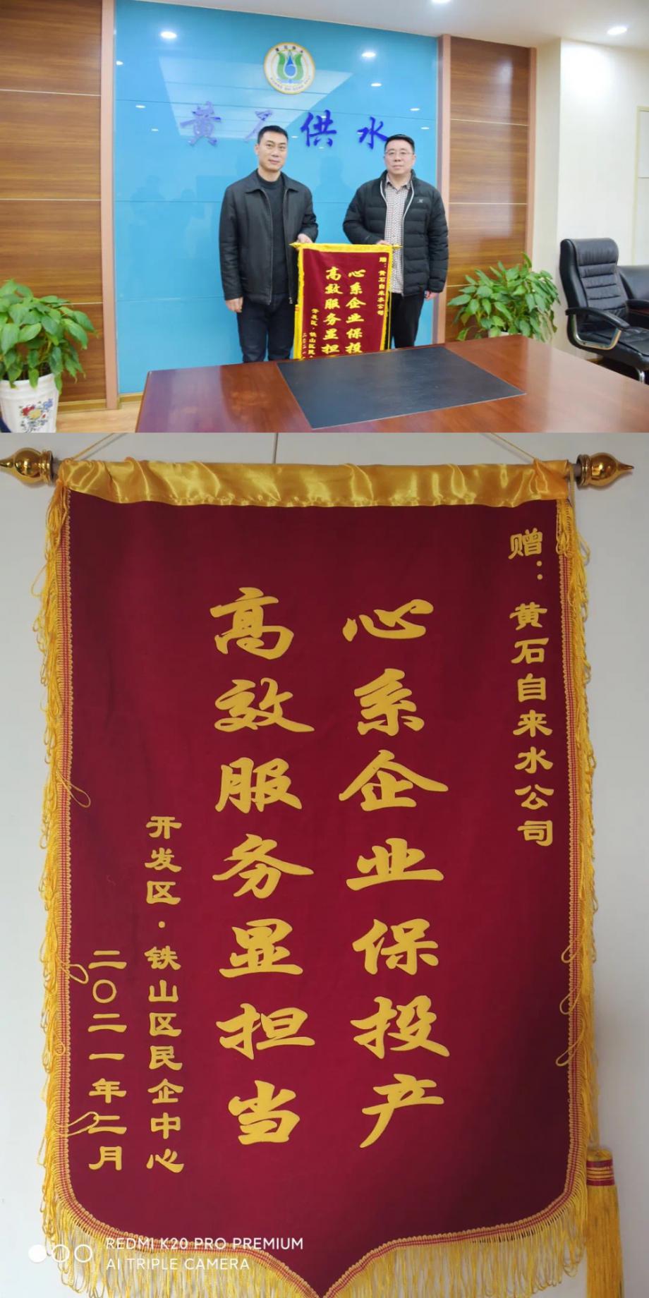 2月8日上午,開(kāi)發(fā)區(qū)·鐵山區(qū)民企中心專(zhuān)程來(lái)到市自來(lái)水有限公司贈(zèng)送錦旗,對(duì)公司保障落戶(hù)企業(yè)用水,提供主動(dòng)作為、高效周到的服務(wù)表達(dá)謝意。開(kāi)發(fā)區(qū)·鐵山區(qū)民企中心副主任徐永華代表民企中心授錦旗。公司黨委委員、副總經(jīng)理袁全保代表公司接錦旗。