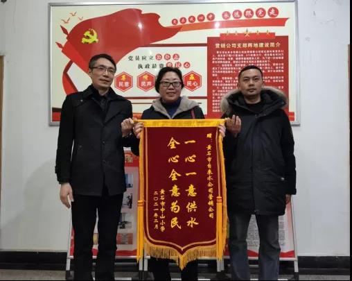 2月26日,中山小學(xué)向市自來水有限公司求助,因新建教學(xué)樓,用水量突增,導(dǎo)致水壓降低,嚴(yán)重影響學(xué)校正常用水。市自來水有限公司立即組織人員趕赴現(xiàn)場,勘察情況,分析原因,提出解決方案,并加班加點免費為學(xué)校安裝戶內(nèi)加壓水泵,解決了學(xué)校的用水難題,保障了學(xué)生安心上課。其后,中山小學(xué)送來錦旗:一心一意供水,全心全意為民。