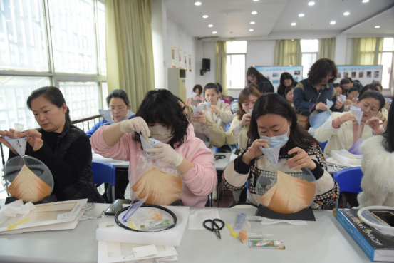活動(dòng)開始,在聽完手作老師關(guān)于流沙畫制作過程的介紹,參與活動(dòng)的女職工們迫不及待開始投入沙畫的創(chuàng)作。將細(xì)小的砂礫晶體從兩塊透明玻璃之間的小孔內(nèi)一點(diǎn)點(diǎn)注入,待向玻璃之間注入凈水、封口后,一副層次分明、變化萬千的“治愈系”的沙畫便制作完成了。