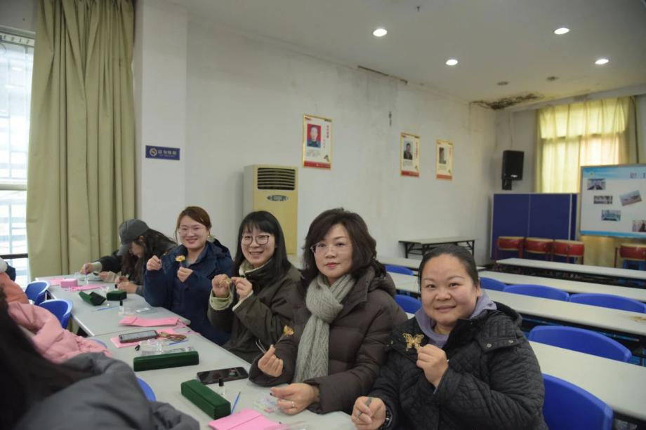 聽完講解后,女職工們迫不及待地開啟了創(chuàng)作之旅,只見她們將顏色各異的大片螺鈿搗碎,挑選心儀的螺鈿片,然后小心翼翼地用膠水將螺鈿片粘貼在胸針底托上。整個(gè)過程需要極大的耐心與細(xì)心,以及考驗(yàn)對色彩的搭配。大家不時(shí)的輕聲交流、相互分享經(jīng)驗(yàn),經(jīng)過一個(gè)多小時(shí)的努力,在一雙雙巧手的打造下,一枚枚精美的胸針便得以完美的呈現(xiàn)。