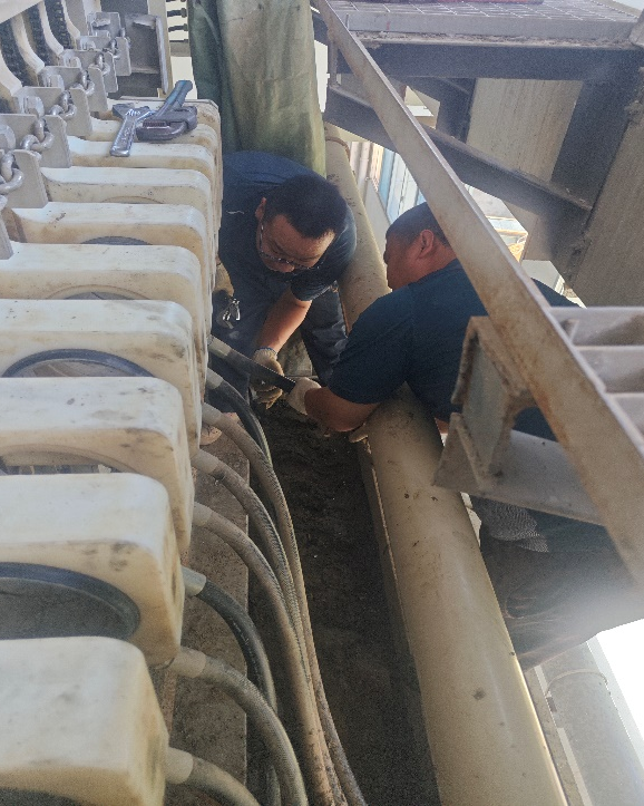 緊急搶修中,維修團隊更顯擔當。花湖廠板框機濾布沖洗管更換,維修人員毫不猶豫鉆進設備狹窄空間,汗水如雨仍爭分奪秒,高效完成舊管拆卸與新件安裝;下陸DN1200閘門維修恰逢正午烈日,大家頂著高溫默契配合,順利完成作業(yè)。